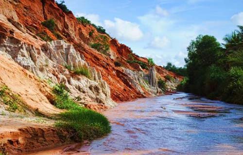 仙女溪是流經(jīng)美奈東側(cè)沙丘和巖層的一條小溪,掩藏在濃密的樹林里。仙女溪的紅土大陸映襯在藍(lán)天白云之間,腳下是細(xì)軟的紅色沙泥,以及只漫過腳踝的淺淺溪水。當(dāng)?shù)堑郊t土的最高處,小小的美奈便盡收眼底,掩映在青山綠樹與遼闊的大海之間,嗅不到任何過度商業(yè)化的氣息。在仙女溪游玩是要赤腳淌水逆行,所以穿短褲或短裙以及拖鞋是最方便的。水很淺,沙細(xì)細(xì)的,經(jīng)過烈日的暴曬,水溫有點(diǎn)暖暖的,赤腳涉水而行,腳踩在細(xì)細(xì)的沙面上,細(xì)沙和著暖暖的水,流溜過你的腳趾縫,那種感覺就像仙女用她那纖纖細(xì)長的手指在替你足浴。這個景點(diǎn),其實(shí)就像是我國云南元謀土林一個微型盆景,屬于典型的紅沙黏土地帶流水地貌。山腰上的小泉水流出來,帶著土林地表的紅沙黏土流到谷底,慢慢的,溪水被染成了紅色,也稱:紅溪。沿著這紅色溪水流淌的精致小峽谷,大約游覽步行20分鐘再折回,也就游完了整個景點(diǎn)。