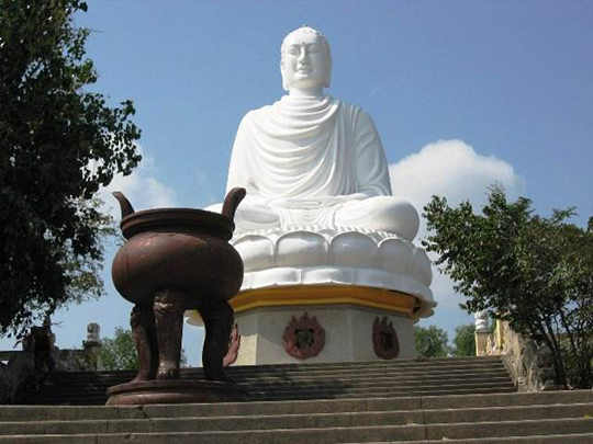 一座中國(guó)式佛寺,建筑上的龍形馬賽克是由琉璃和陶瓷瓦片裝飾而成的。這座塔寺始建于19世紀(jì),至今寺中還住著和尚。在寺后的山上,有一尊全鎮(zhèn)都看得見(jiàn)的巨大的石觀(guān)音雕像。從山上可以俯瞰整個(gè)芽莊市區(qū)和海濱。山下東面北面的椰林茂密。風(fēng)光自然而原始,夕陽(yáng)之下越益迷人。