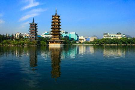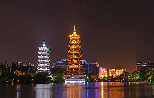 桂林日月塔又稱(chēng)金塔銀塔、情侶塔;日塔別名叫金塔,月塔別名叫銀塔,所以也有金銀塔之稱(chēng)。日月雙塔坐落在桂林市美麗的杉湖中,日塔為銅塔,位于湖中心,高41米,共9層,月塔為琉璃塔,高35米,共7層。兩塔之間以湖底一條10米長(zhǎng)的湖底隧道相連。
