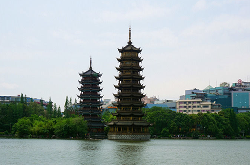 日月雙塔:坐落在杉湖中,日塔為銅塔,位于湖中心,高41米,共9層,月塔為琉璃塔,高35米,共7層。兩塔之間以18米長的水下水族館相連。銅塔所有構(gòu)件如塔什、瓦面、翹角、門拱、雀替、門窗、柱梁、天面、地面等均由鋼材鑄鍛而成,并以精美的銅壁畫裝飾,整座銅塔涵蓋了三項世界之最--世界上最高的銅塔,世界上最高的銅質(zhì)建筑物,世界上最高的水中塔。日月雙塔是桂林兩江四湖夜景重要的景色之一 。
