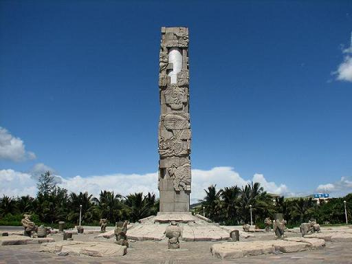 亞龍灣中心廣場,位于三亞市東南28公里處。騰柱向藍(lán)天升騰,以雕塑群向大地和大海延伸,其宏偉氣勢和獨特的藝術(shù)造型,以有限的藝術(shù)空間形式,引導(dǎo)我們的想象向無限的空間擴展。屹立的圖騰柱是廣場的最高點,高26.8米,由200多塊巨大的花崗石和直徑2.5米的鋁合金柱組成。上面雕刻有龍、鳳、太陽鳥、魚以及風(fēng)雨雷電四神的圖案。 圍繞圖騰柱的中心雕塑區(qū),形成三圈石硨,氣勢宏大、形象獨特:第一圈有蒼龍、白虎、朱雀、玄武四季標(biāo)識與日晷24節(jié)氣雕塑;第二圈表現(xiàn)盤古開天地、女媧補天、嫦娥奔月、弄天舞干戚、大禹治水、牛郎織女、后羿射日、夸父追日等八個遠(yuǎn)古神話;第三圈反映天文、人、動物、植物萬物生靈及八位中國古代之神。圖騰柱和雕塑群渾然一體,構(gòu)成強烈的中國古天文意識和東方神秘色彩。廣場外圍設(shè)計的五組白色風(fēng)帆式的尖頂帳篷及大型彩色噴泉,給具有古老文化意蘊的雕塑增添了現(xiàn)代氣息。