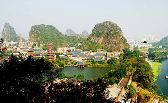 疊彩山舊名桂山,位于桂林市區(qū)東北部,濱臨漓江。疊彩山與城中的獨(dú)秀峰、漓江畔的伏波山鼎足而立,同為城內(nèi)的游覽勝地。疊彩山占地面積約2平方公里,由明月峰、仙鶴峰和四望山、于越山組成,橫亙市區(qū),景色優(yōu)美,又易于攀登,為桂林山景中的一個(gè)熱點(diǎn)。山中佳景甚多,有疊彩亭、于越閣、瞿張二公成仁碑、仰止堂、仙鶴洞、風(fēng)洞、疊彩樓、望江亭和拿云亭等名勝。